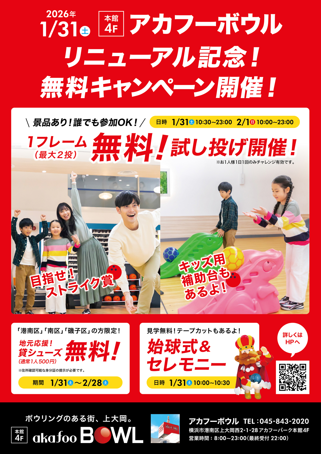本館4Fのボウリング場「アカフーボウル」は、1/31(土)AM8:00にリニューアルオープンいたします!ボウリングのある街、上大岡。