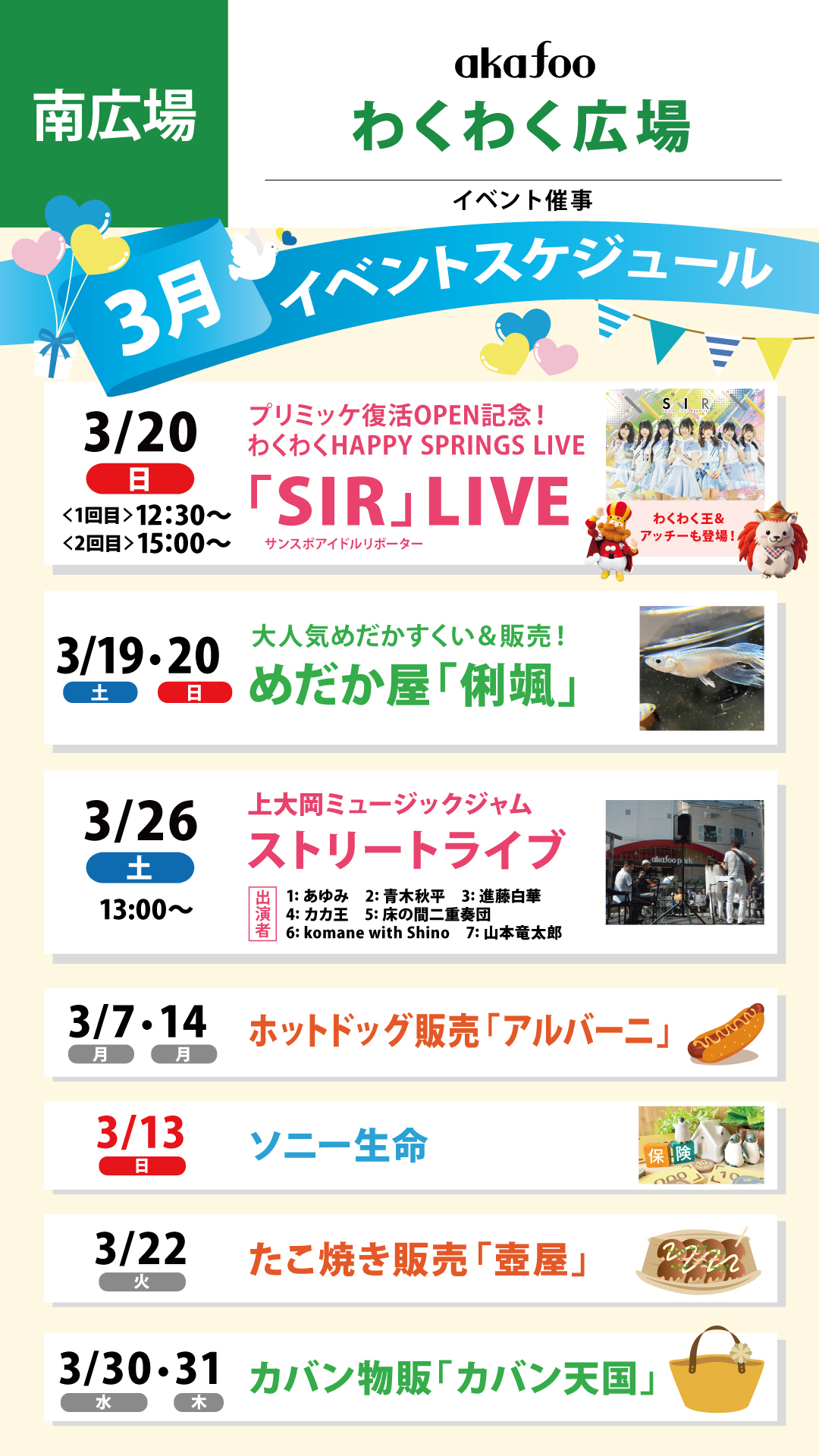 アカフーわくわく広場(オーケー側南広場)の3月のスケジュールをお知らせいたします。