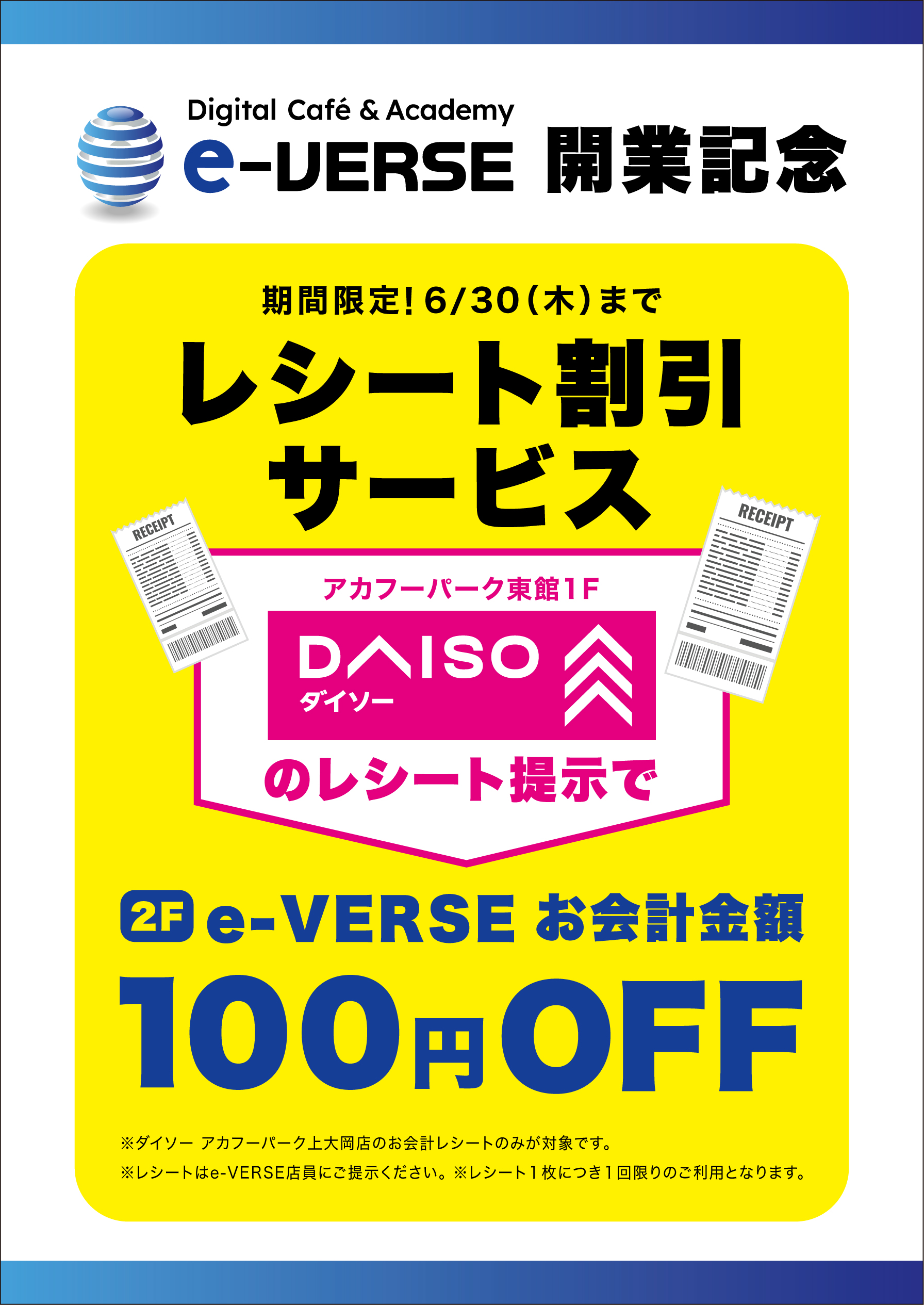 【e-VERSE開業記念 レシート割引サービス】ダイソーのレシート提示でe-VERSEお会計から100円OFF
