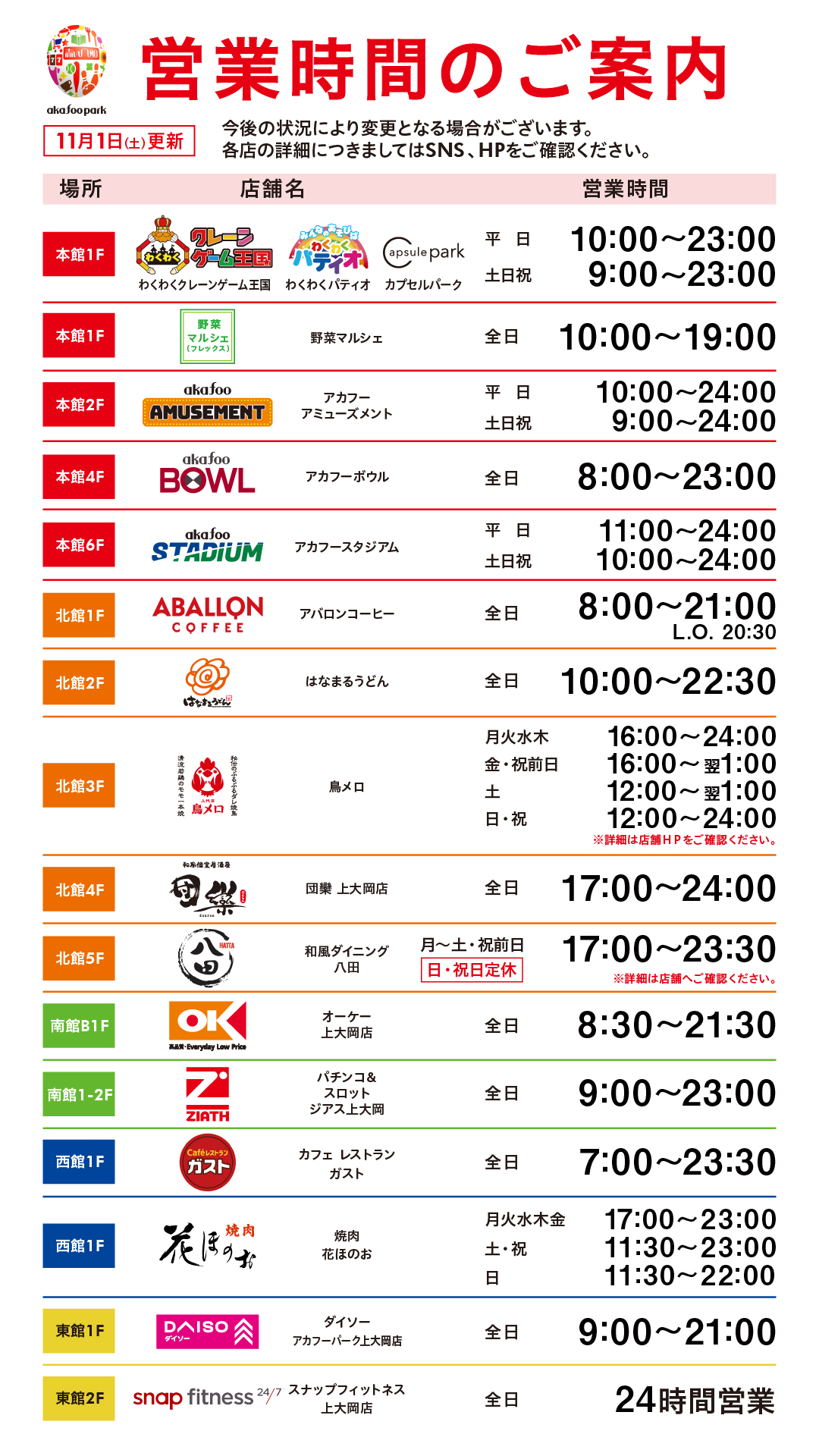 【11/1更新】アカフーパーク通常営業時間のお知らせ