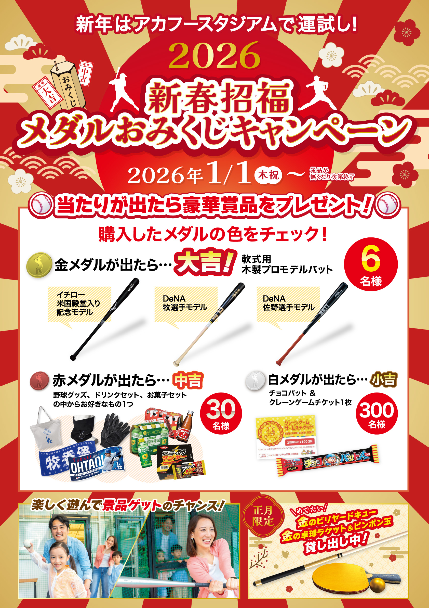 新年の運試し、冬の運動不足解消にもぴったり!お正月もアカフースタジアムで楽しんでくださいね。