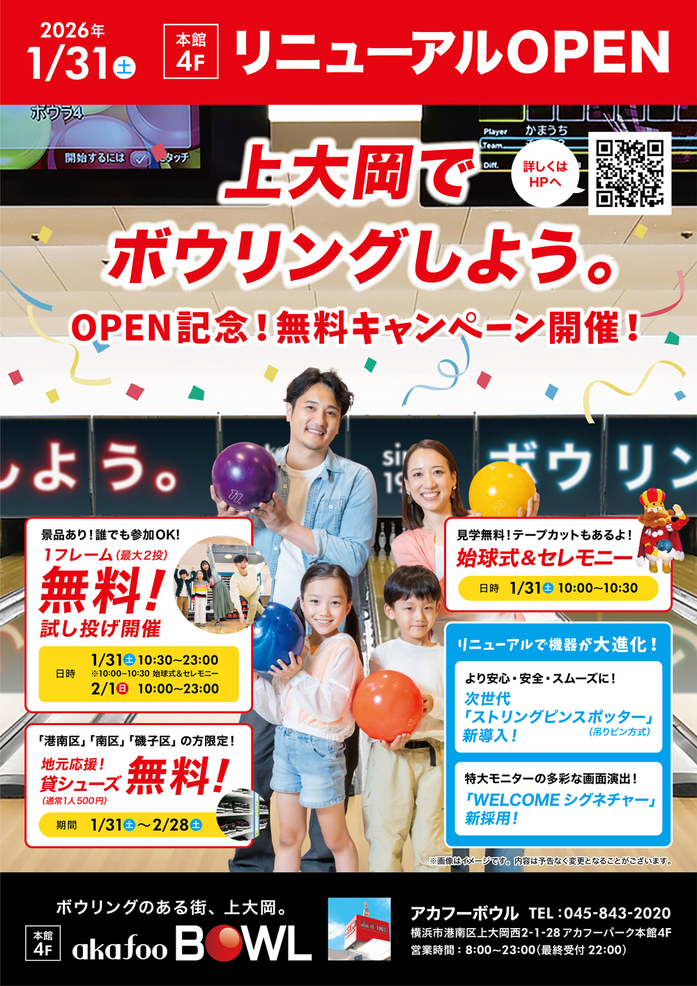 本館4Fのボウリング場「アカフーボウル」は、1/31(土)AM8:00にリニューアルオープンいたします!ボウリングのある街、上大岡。