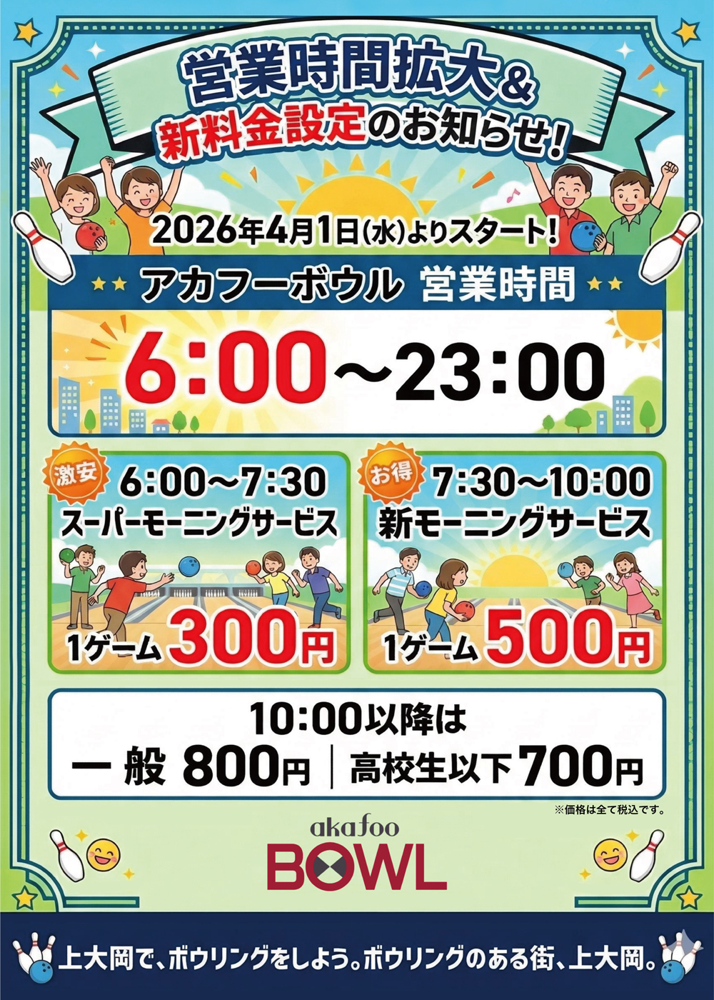 現状の8時オープンより2時間早い、朝6時よりボウリングをお楽しみ頂けるようになります。